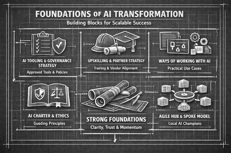 The foundation stage is not about scale or sophistication. It is about establishing the right artefacts, structures, and relationships to create clarity, trust, and momentum.If you are shaping or reassessing the foundation stage of an AI transformation and want to explore how these artefacts could be tailored to your organisation and industry, I welcome the conversation.